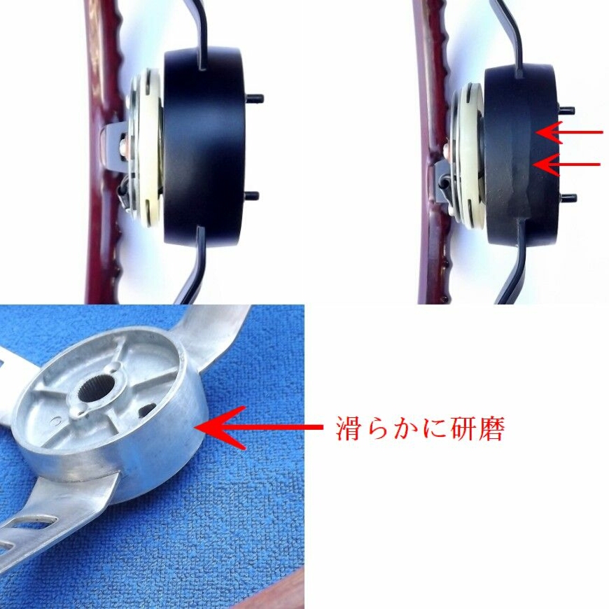 当方は、時間を掛け、ボス周辺を滑らかに研磨しましたので、高級ステアリングを訪仏させる大変美しい仕上がりになっています。(左写真)