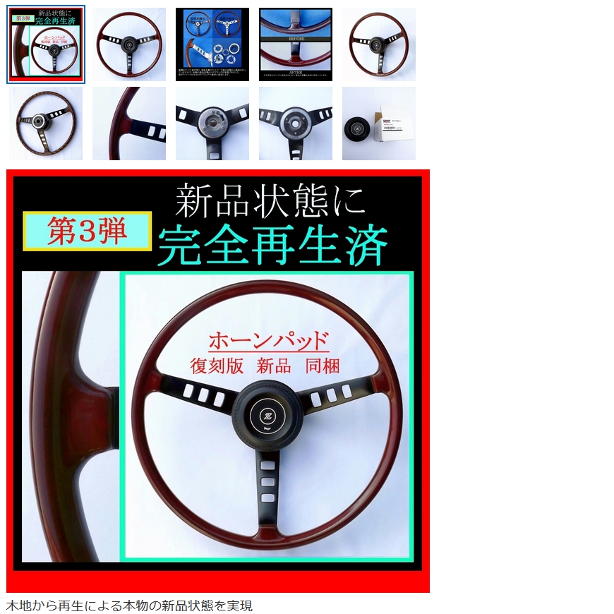 従来の木製ステアリングの再生方法は、古い塗膜の上からクリアー塗装を施したり、木目を諦め、革巻きにしてしまう方法がとられてきましたので、「覆刻再生品」は、おそらく世界唯一であり、車雑誌掲載により知名度が上がるにしたがって将来的にはプレミアも期待しています。