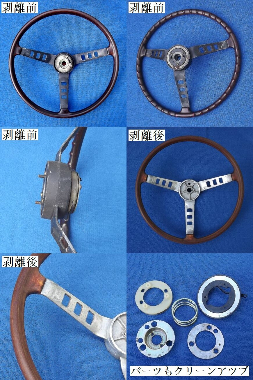 1. 当時物、純正ステアリングの、木部、スポークの塗膜をすべて剥ぎ取り、木地の状態に致しますので、この時点から工場生産ラインの第一段階と同条件の素材の状態になります。