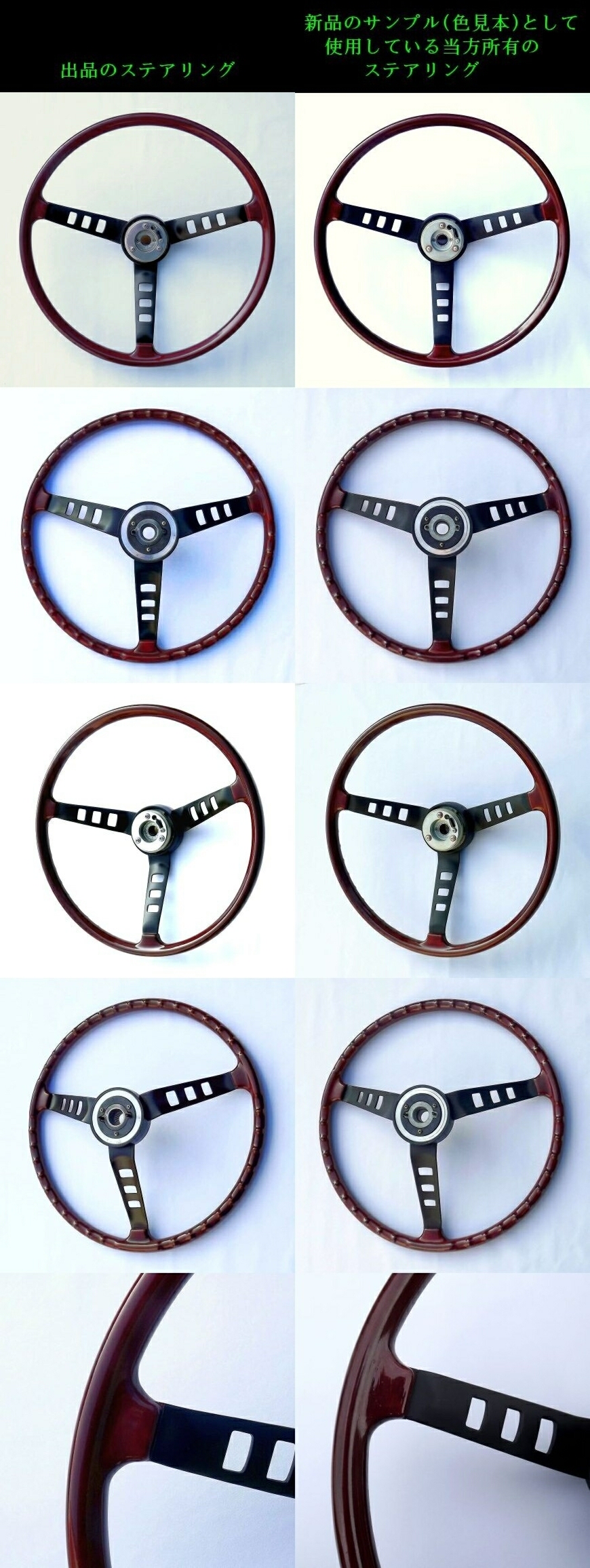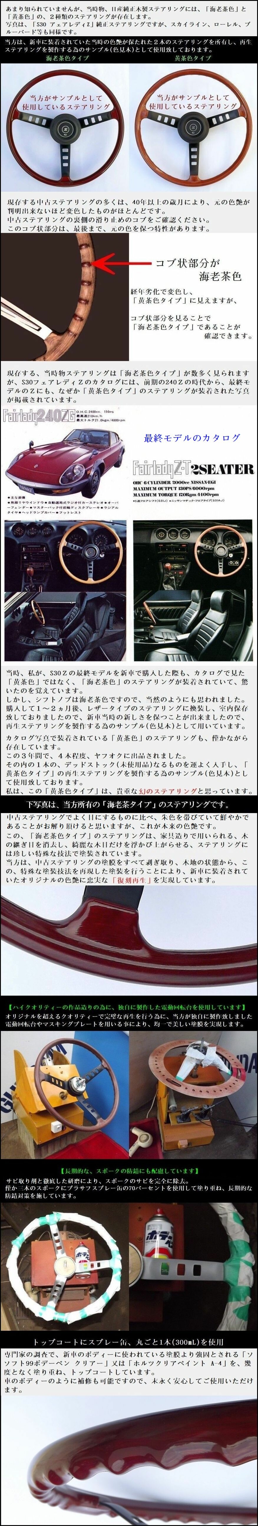 2. 当方は、新品状態の色艶を保持することができた、当時物、純正ステアリング、「海老茶タイプ」と「黄茶色タイプ」の2本を所有していますので、再生ステアリングのサンプル(色見本)として使用することができます。