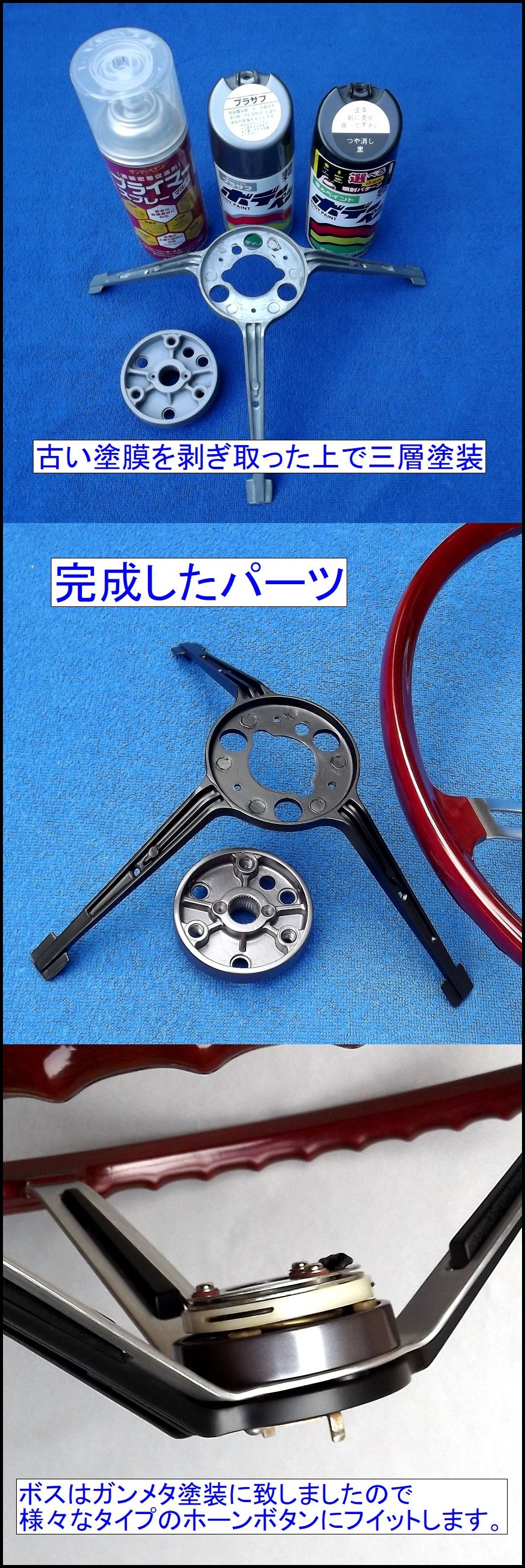 本品のスポークは、マッドブラック塗装仕様でしたが、塗膜を剥ぎ取ると大変奇麗なステンレスが現れました。せっかく奇麗なステンレスですので、当工房は、入念に研磨し、ステンレス生地仕様に変更しました。ボス周辺とホーンボタンステーは合金製でしたが、古い塗膜を全て剥ぎ取り、将来的にも錆が発生しないように三層塗装を施しました。このステアリングには、色々なタイプのホーンボタンが装着可能ですが、あらゆるタイプにフイットする色合いのガンメタ塗装と致しました。
