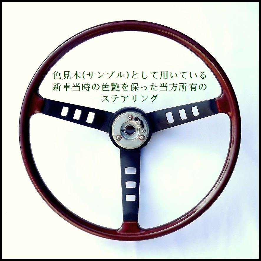 ●下写真は、復刻再生ステアリングを製作する際の、色見本(サンプル)として用いております、40年以上前の新車当時と変わらない色艶を保っている当工房所有のステアリング(海老茶色タイプ)です。