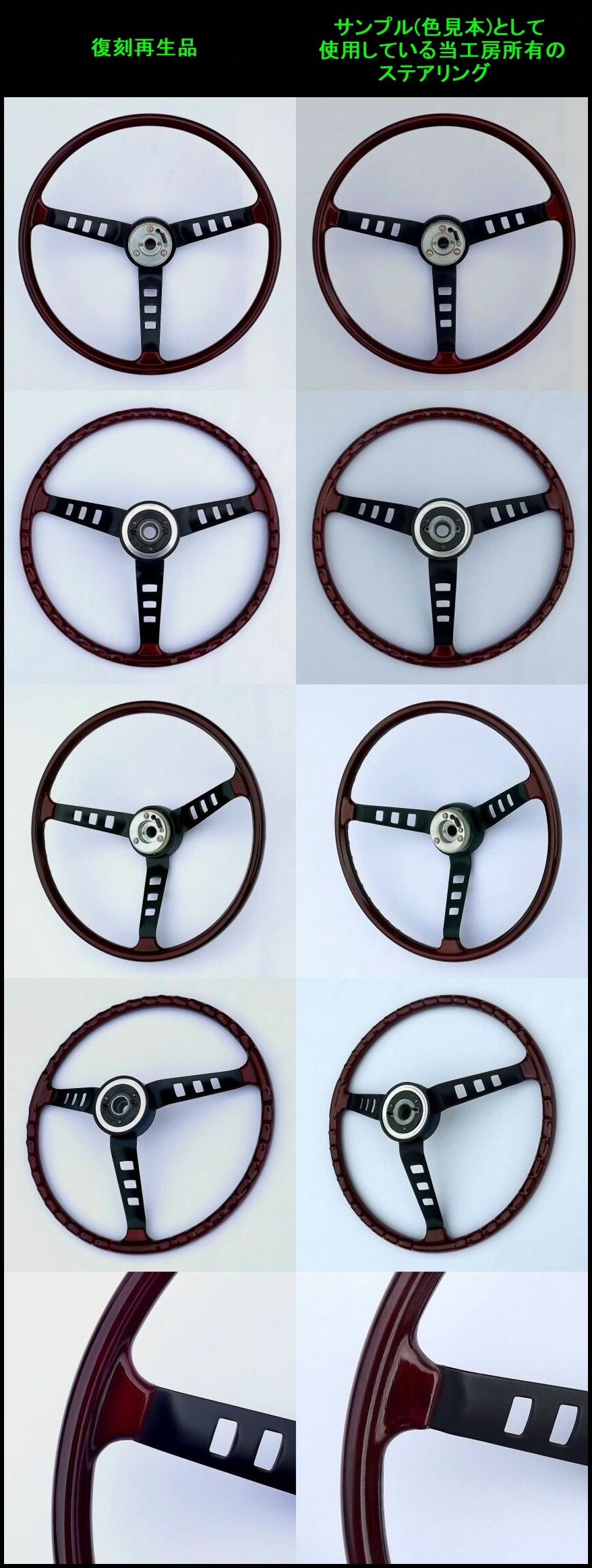 当工房では、新車当時の色艶を保つ、S30フェアレディZの、「海老茶タイプ」と「黄茶色タイプ」の二本のステアリングを所有し、色見本(サンプル)として用いています。
