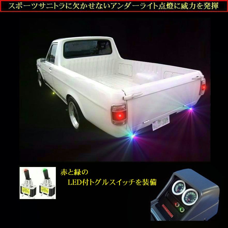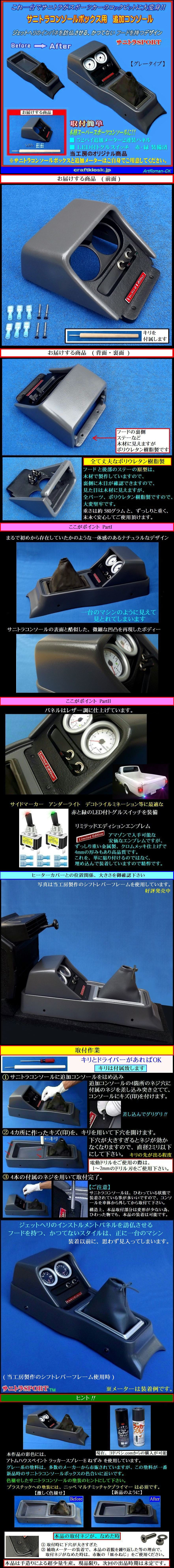 ●当工房オリジナルのサニトラコンソールボックス用 追加コンソールの出品です。 ●メーターパネル(52パイに2連装規格)を装備。 ●赤と緑のLED付 トグルスイッチを装備しています。 ●お手持ちのサニトラコンソールボックスのポケットにピッタリとハマルように設計しています。 ●キリとドライバーだけで、簡単に装着して頂くことができます。 ●これ一台で、サニトラをスポーツカーのコックピットに一変させることができます。 ●ご質問がございましたら、ご遠慮なくお問い合わせください。