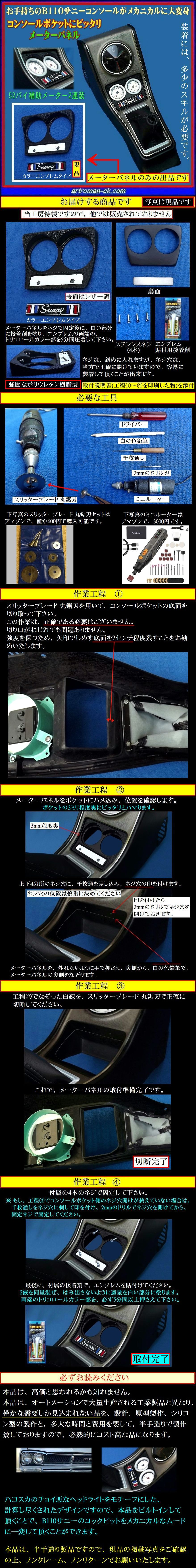 当工房オリジナルのメーターパネル(52パイに2連装規格)の出品です。 ●お手持ちのB110サニーのコンソールボックスのポケットにピッタリとハマるように設計しています。 ●装着には、多少のスキルが必要ですが、ピッタリとハマりますので、慣れた方でしたら、容易に作業ができます。 ●B110サニーのコックピットをメカニカルなムードに一変させることができます。 ●ご質問がございましたら、ご遠慮なくお問い合わせください。