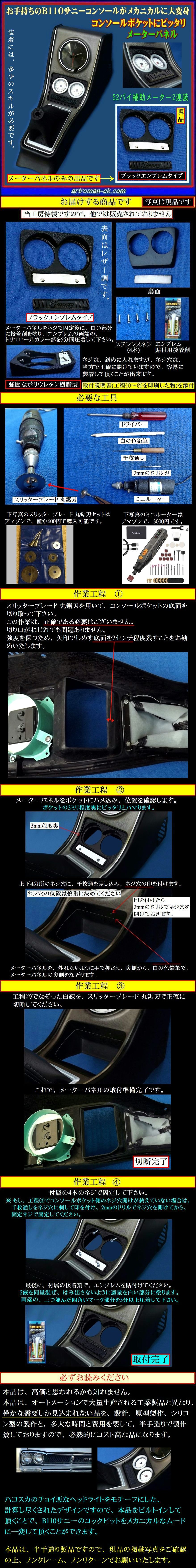 ●当工房オリジナルのメーターパネル(52パイに2連装規格)の出品です。 ●お手持ちのB110サニーのコンソールボックスのポケットにピッタリとハマるように設計しています。 ●装着には、多少のスキルが必要ですが、ピッタリとハマりますので、慣れた方でしたら、容易に作業ができます。 ●B110サニーのコックピットをメカニカルなムードに一変させることができます。 ●ご質問がございましたら、ご遠慮なくお問い合わせください。